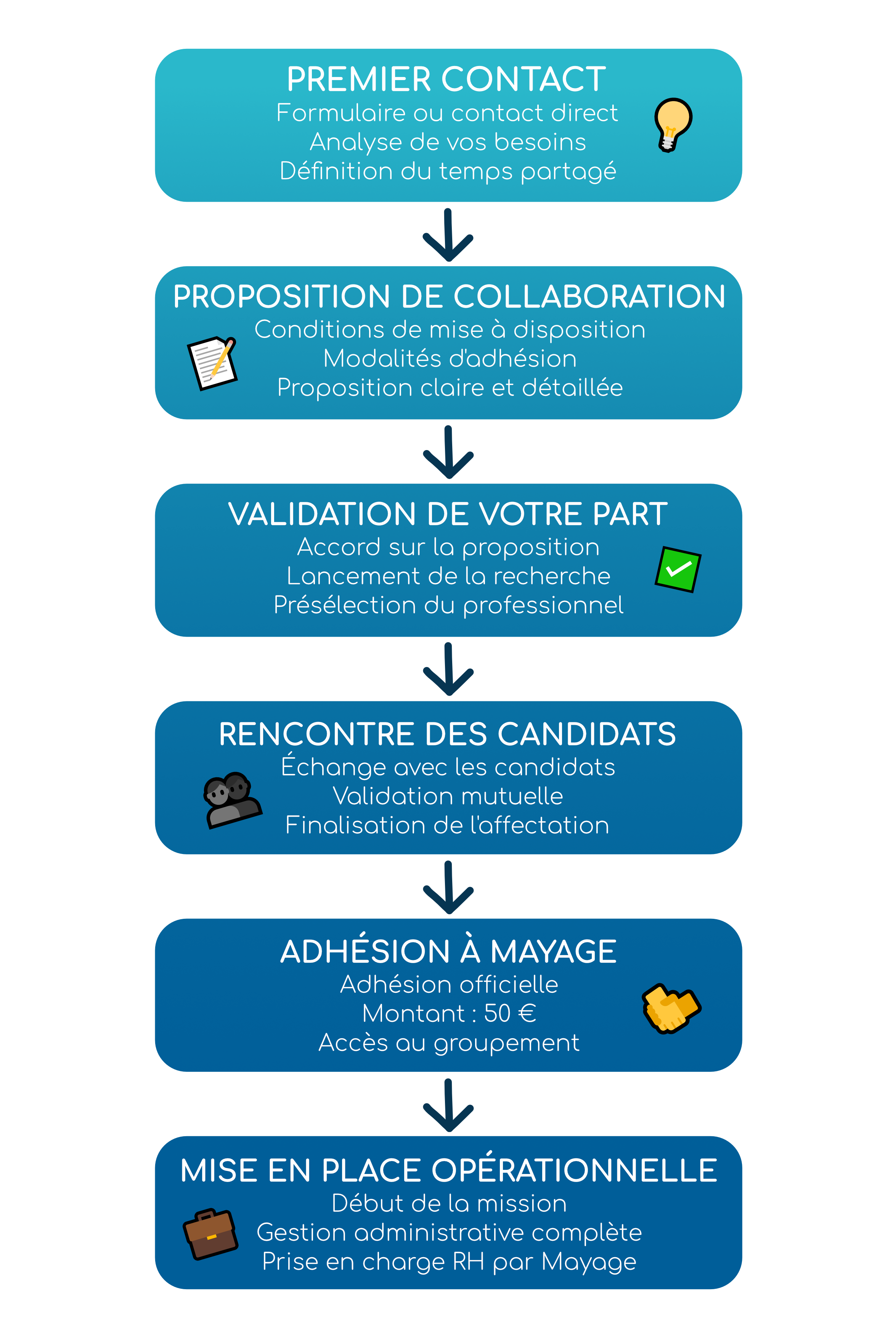 Vous échangez avec le candidat rencontré par MAYAGE et présélectionné. S’il correspond à vos attentes, nous finalisons ensemble son affectation.